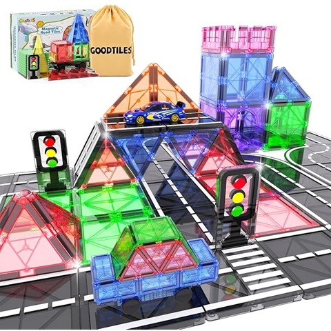Freiplin Magnetic Tiles Road Set with Carne, Road Pieces and Truck, Magnetic Building Blocks