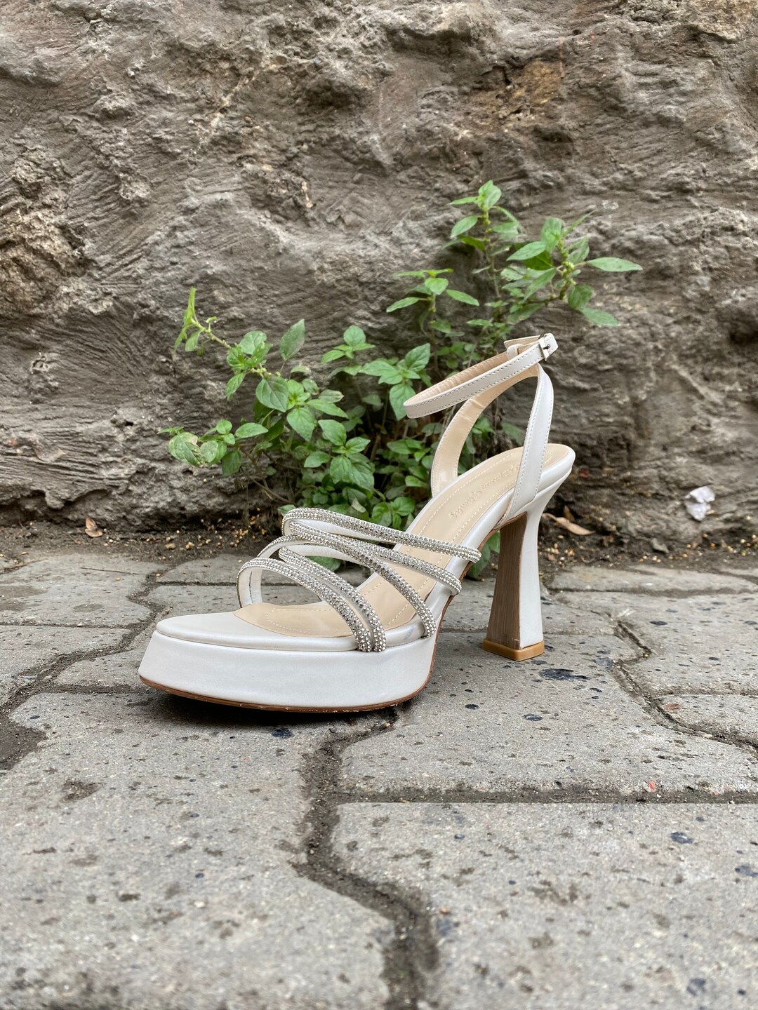these are some beautiful bridal shoes in white with high heels and straps, the shoes have big