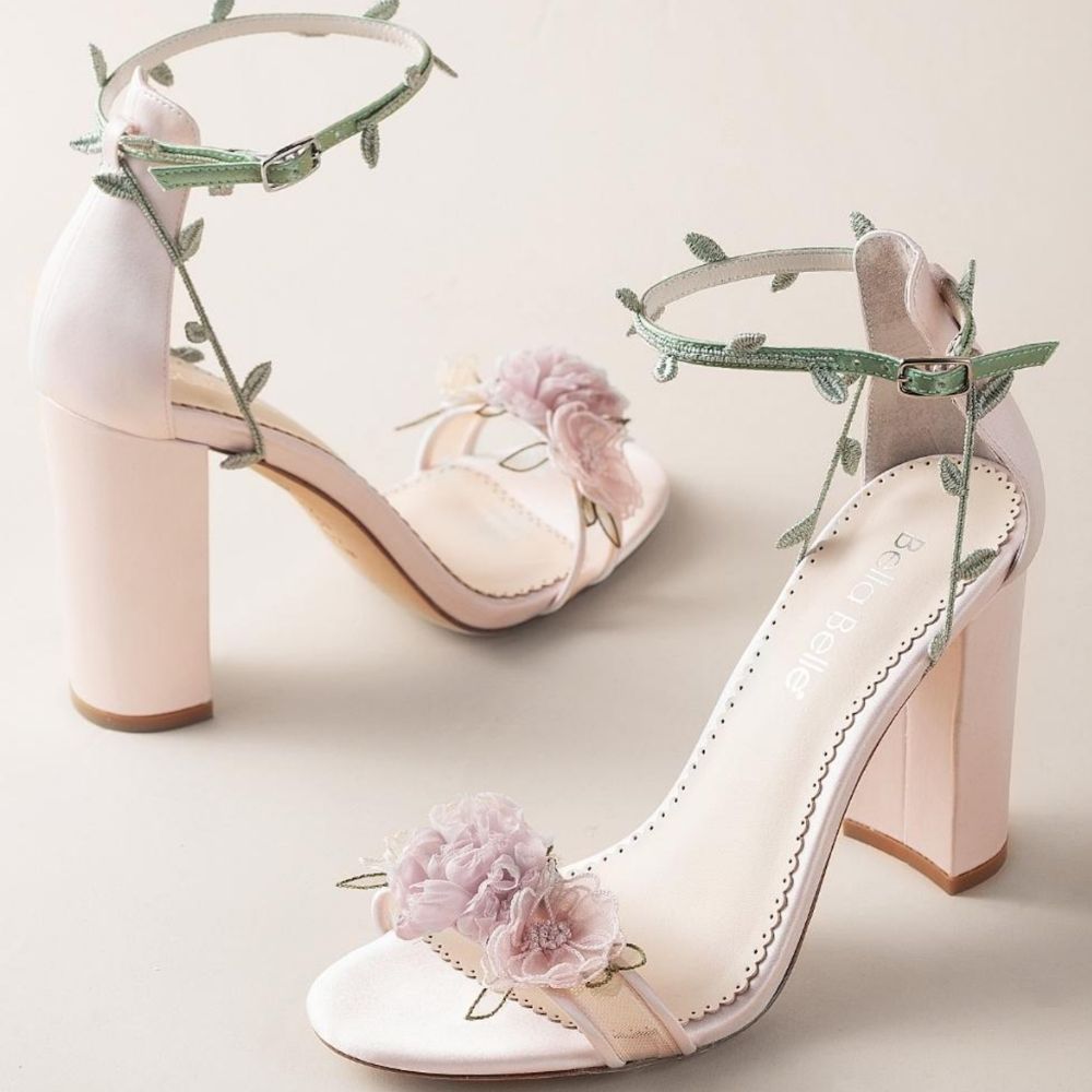 Blush Block Heels with 3D Flowers for Garden Weddings