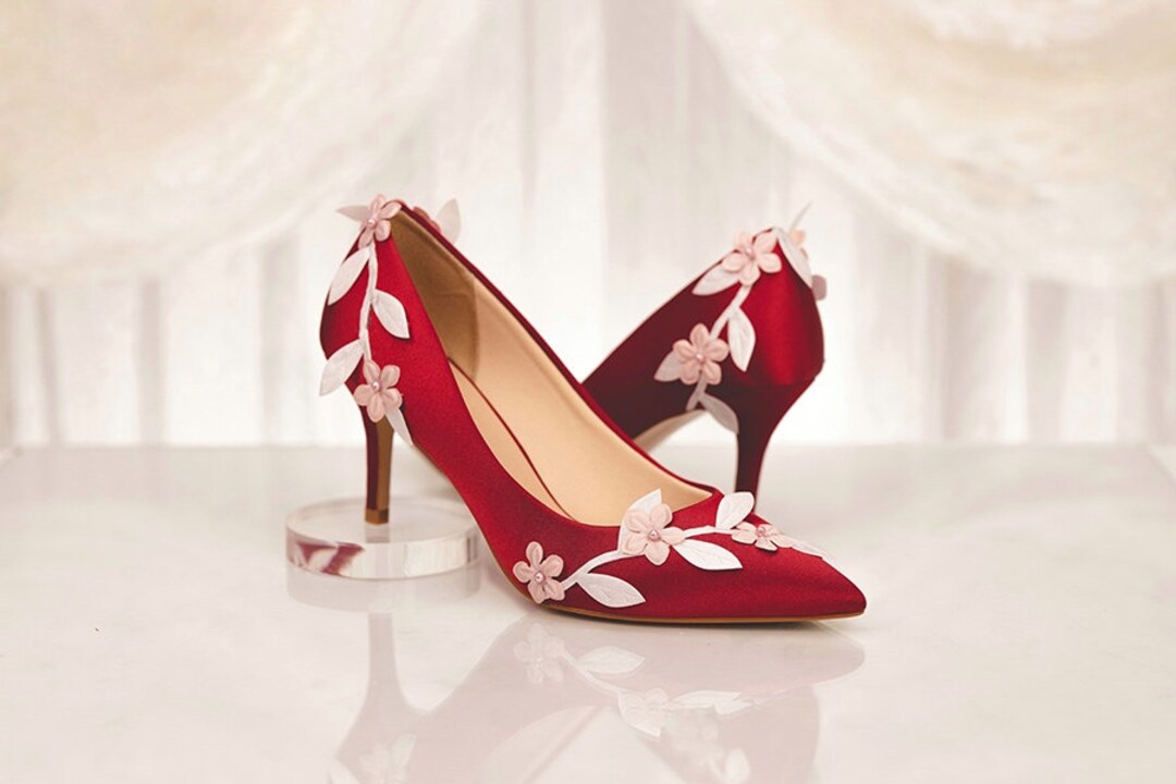 Wine Red Pearl Strap Pointed Closed Toe Satin Bridal Shoes Low Heels â FloraShe