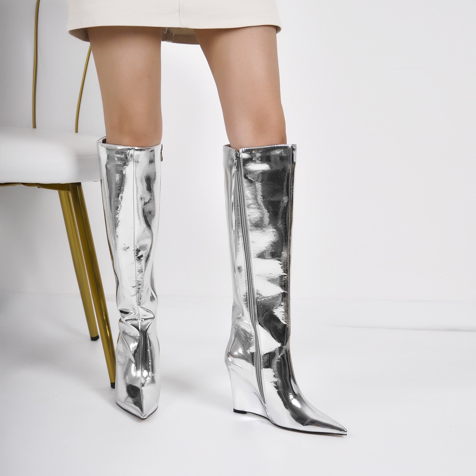 Pointed Toe Metallic Wedge Heel Knee High Boots â Onlymaker