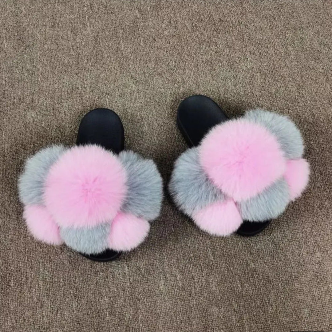 Pom-pom Fur Slides, Furry Slippers, House Shoes, Fall Slippers, Gifts for Her, Gifts Under 100