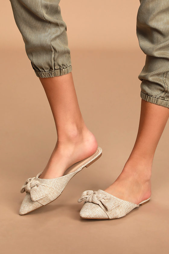 Trendy Beige Flats - Woven Pointed-Toe Slides - Chic Bow Flats - Lulus
