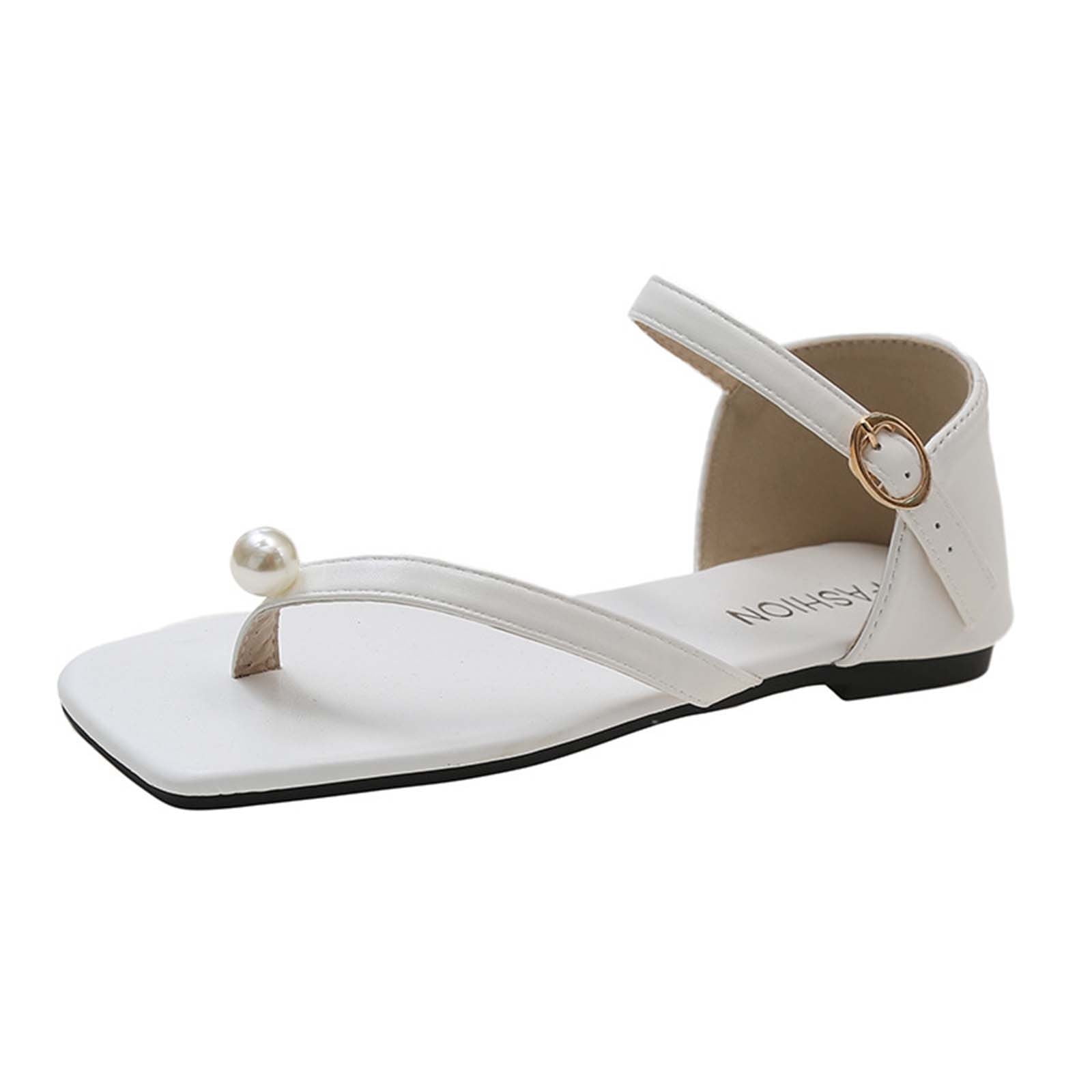 FNFYFH Wedding Shoes for Bride Flat Sandals Open Toe Pearl Bridal Shoes Flat Wedding Sandals for