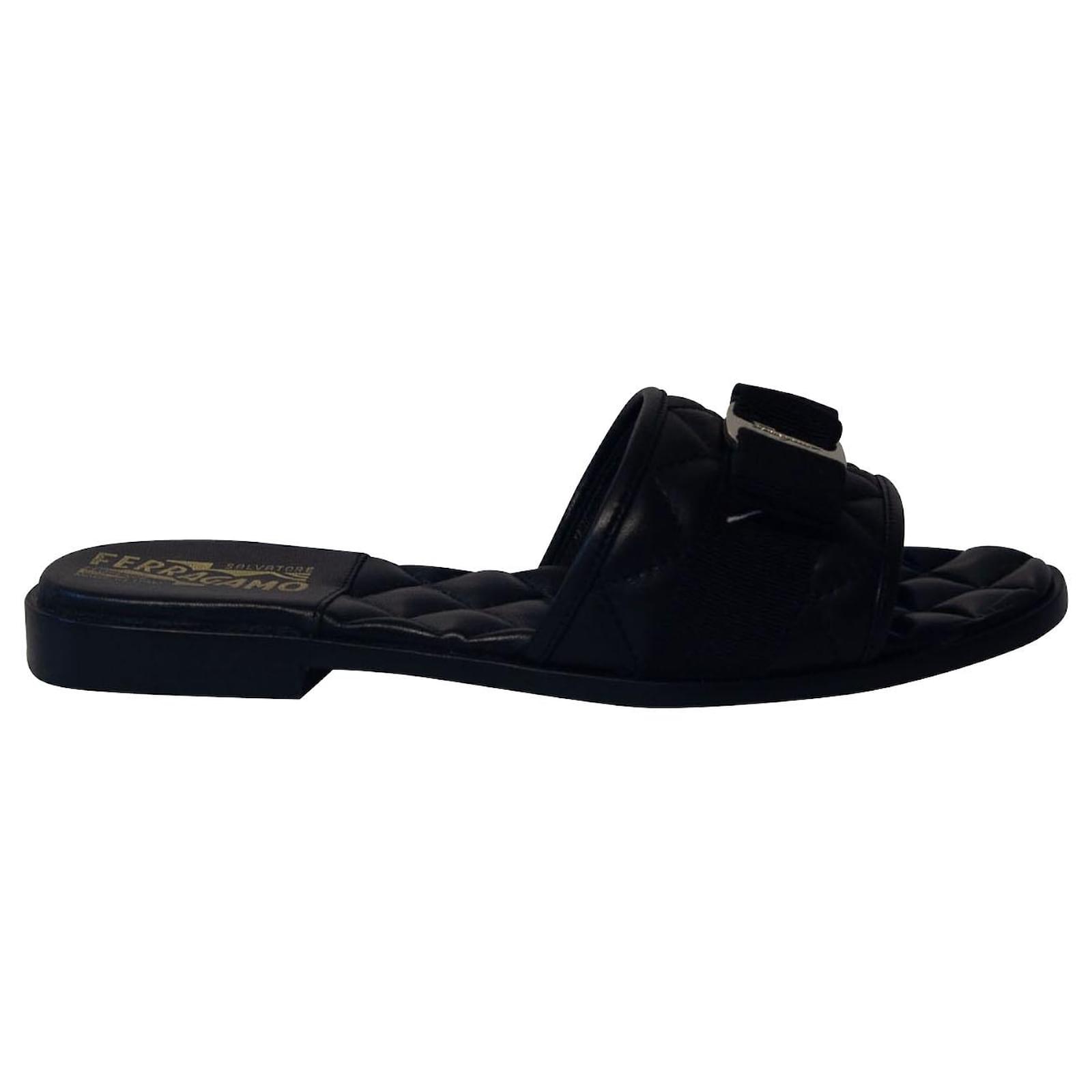 Explore a Salvatore Ferragamo Black Leather Bow Accent Slides - 7.5 - Authenticated Pre-Owned