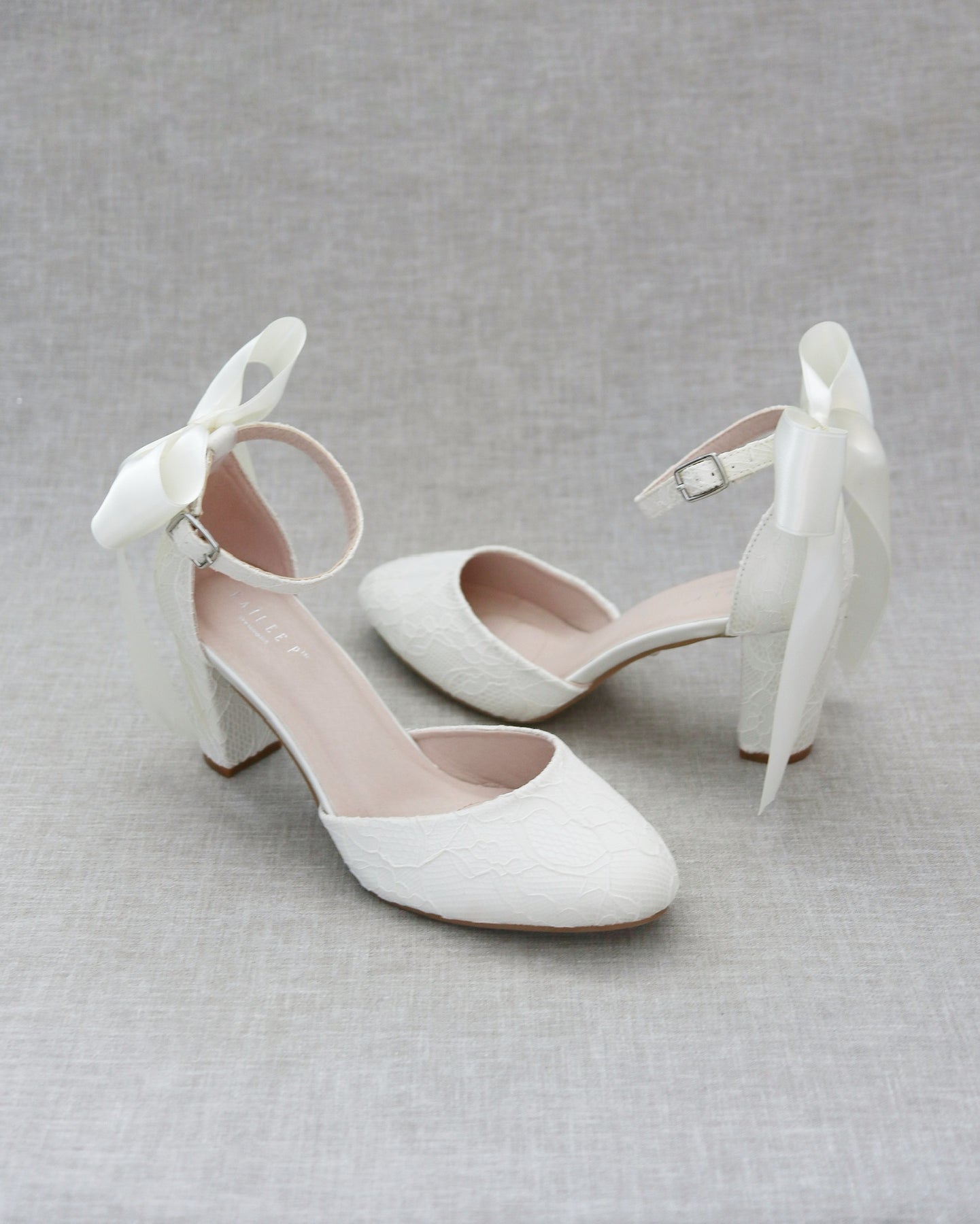 Ivory Lace Block Heel with Satin Back Bow - Women Shoes, Bridal shoes, Bridesmaid shoes â Kailee