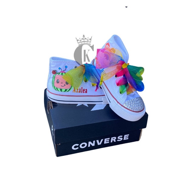 Cocomelon shoes- Cocomelon bling Converse-Girls Cocomelon Shoes-Cocome â Pink Toes & Hair Bows