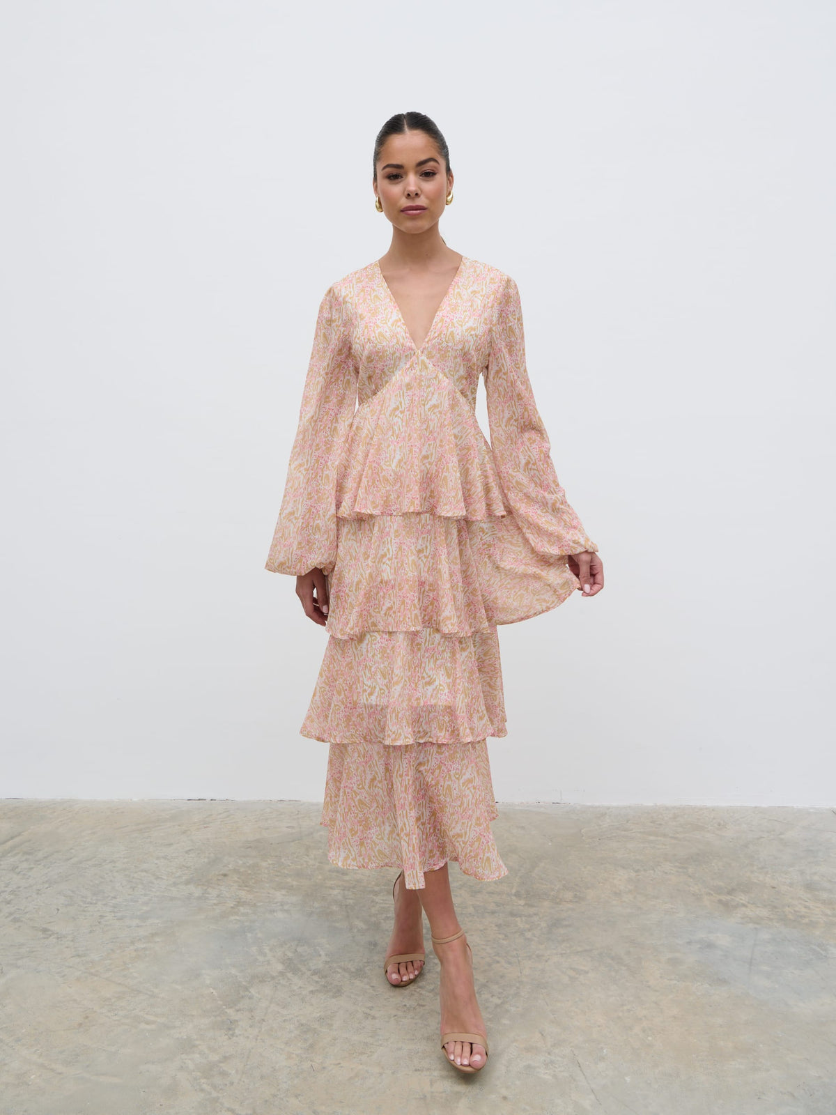 Ashton Ruffle Midi Dress Curve - Dusky Rose Watercolour â Pretty Lavish