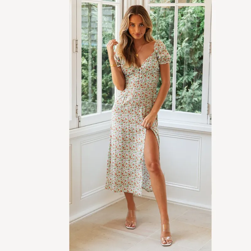 Floral Printed Side Slit Midi Dress - newme