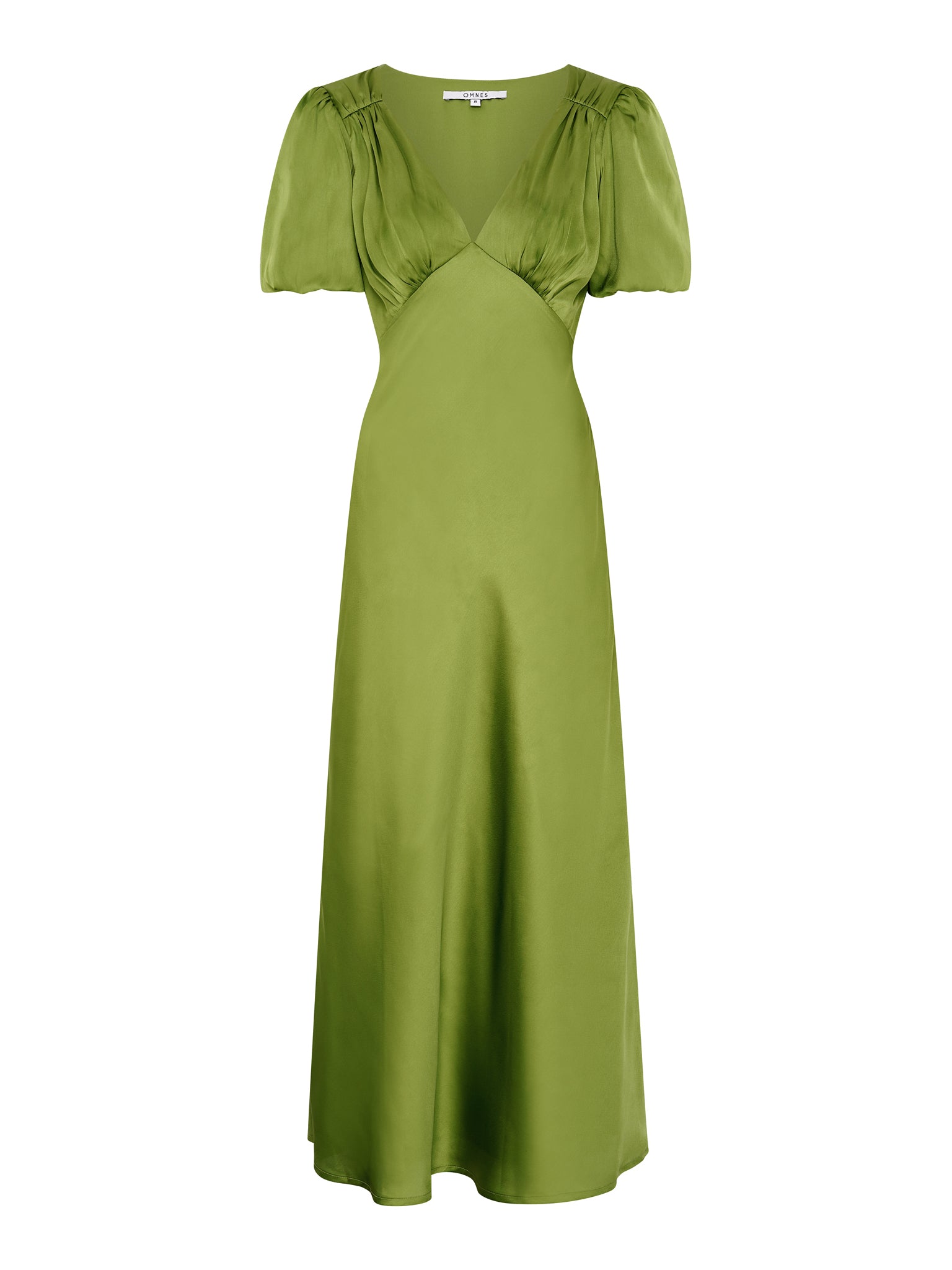 Rosie Ruched Puff Sleeve Dress in Sage | OMNES | Ethical & Affordable Clothing | Shop Women's