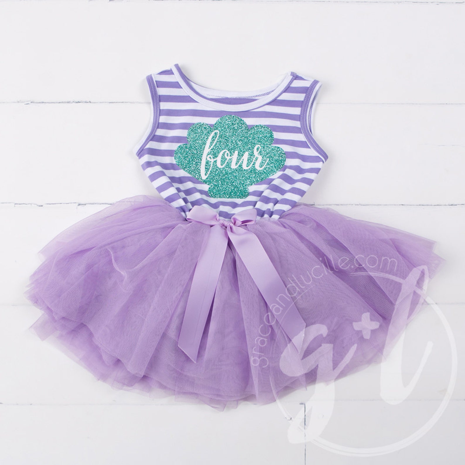 Fourth Birthday Floral Outfit Dress With Script Four and Purple Tutu for Girls or Toddlers