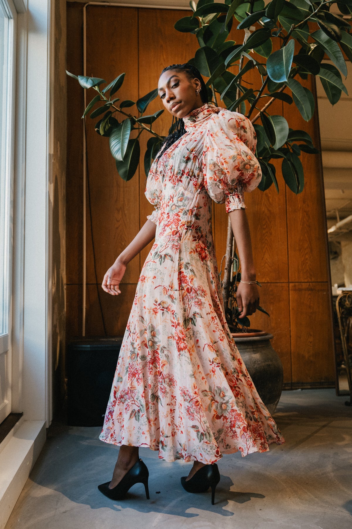 Long Sleeves Organza Floral Dress with Ruffles - Le Merge