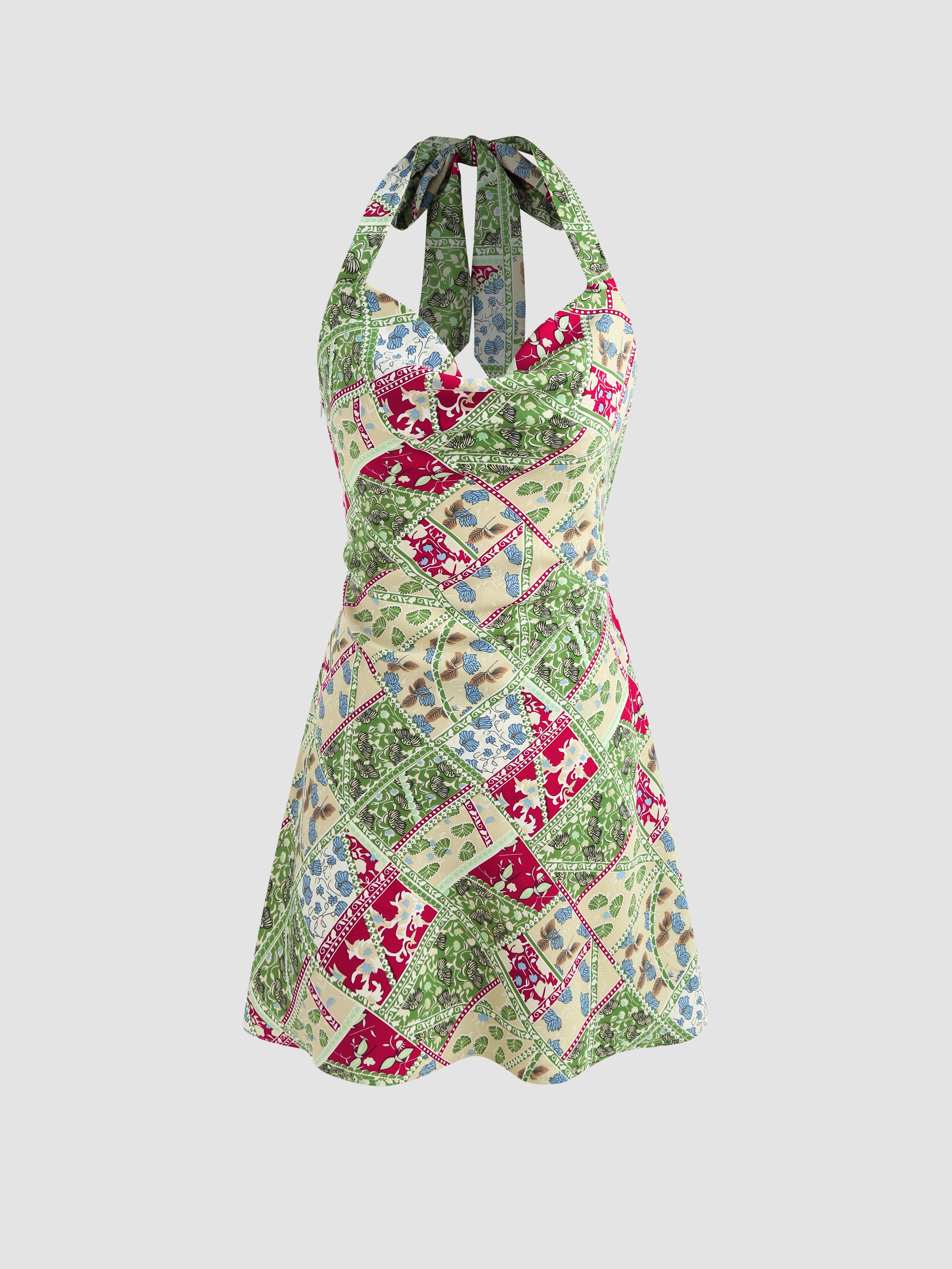 Floral Halter Cut Out Knotted Mini Dress For Date