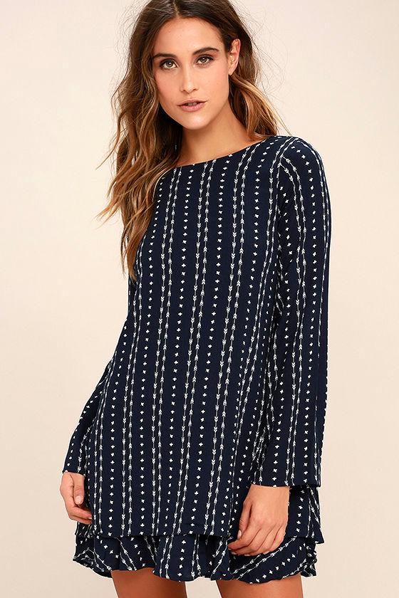 Pretty Navy Blue Dress - Print Dress - Long Sleeve Dress - $44.00 - Lulus
