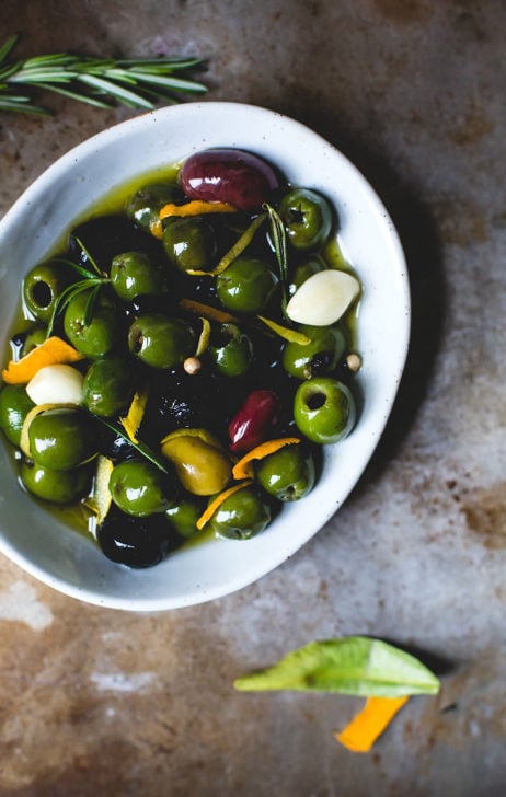 Warm Marinated Olives with Lemon Zest, Rosemary, and Almonds | Feasting At Home