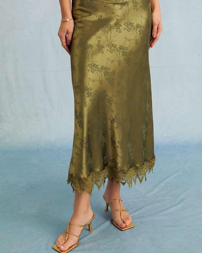 The Green Jacquard Cap Sleeve Satin Midi Dress - Satin Floral Green Midi Dress With Sleeves