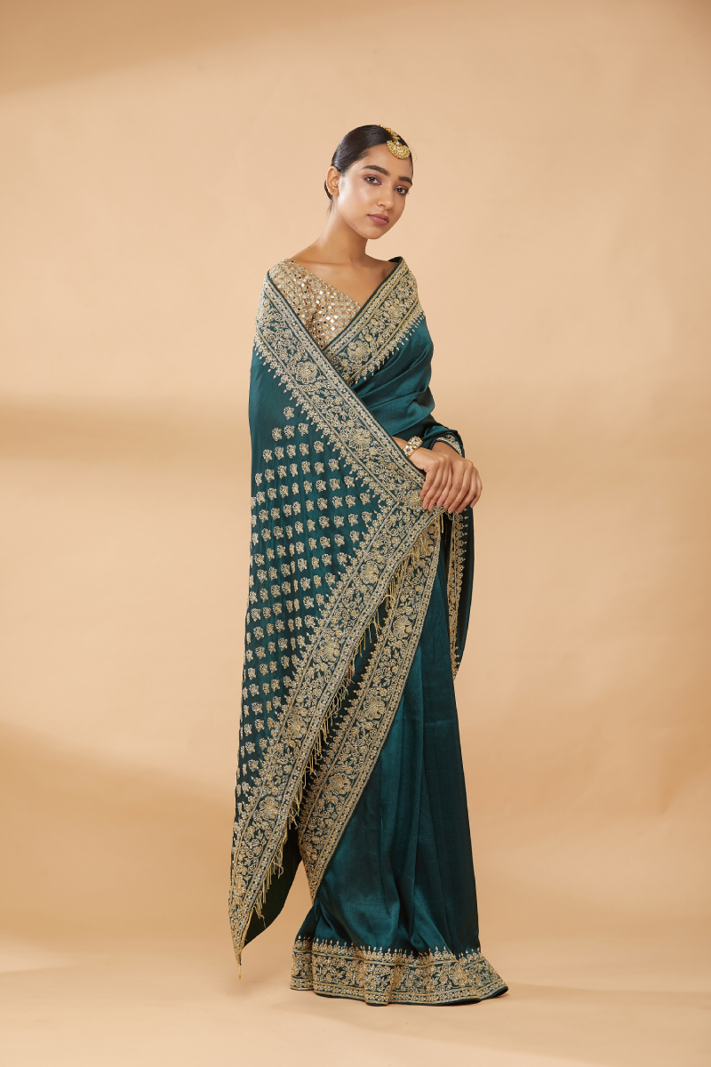 Teal green satin wedding saree with heavy embroidered blouse 8014