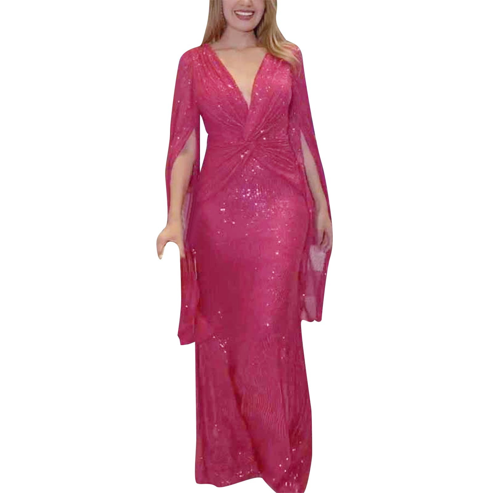 Women Formal Dress Wedding Bridesmaid Dress Sequin Slit Long Sleeve Long V Neck Beaded Evening