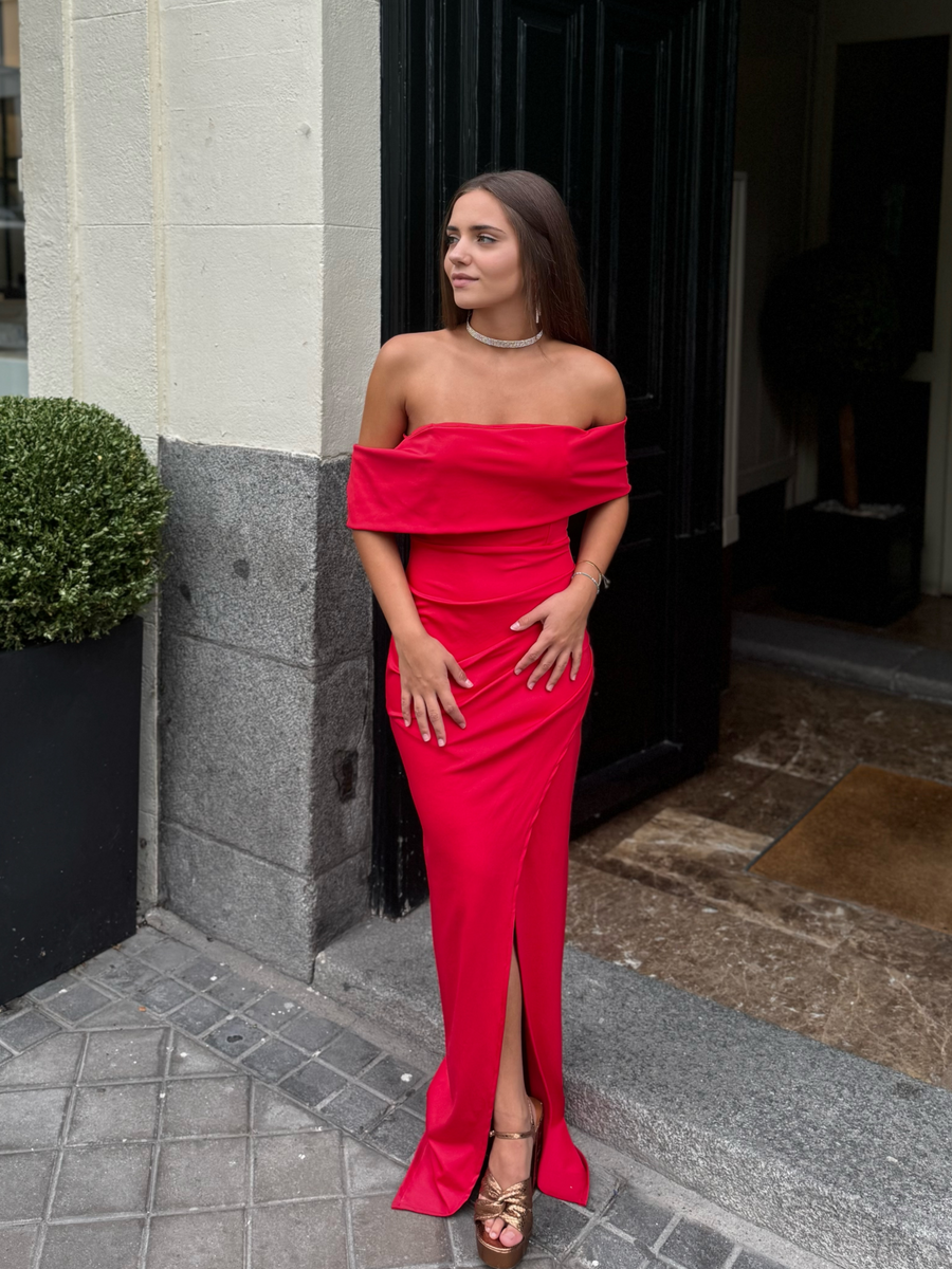 Wedding Guest Red Bardot Midi Dress | Pink Boutique