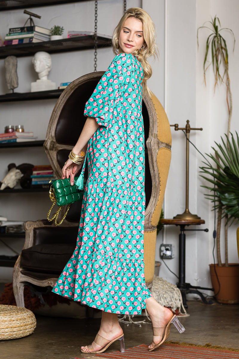 Print Three Quarter Puff Sleeve Maxi Dress. â CEZELE